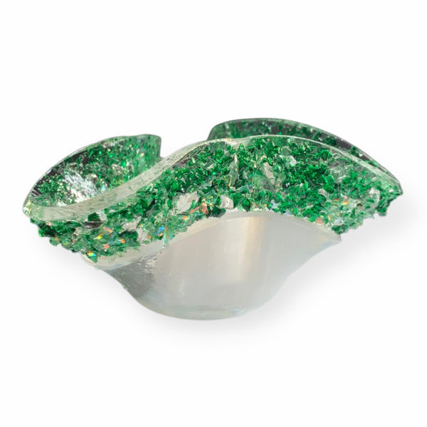 Lift the holiday mood with this festive votive made with shimmering shards of rich green glass and a snowy white base. The alpine forest theme is easily carried throughout the year. 3” x 3”